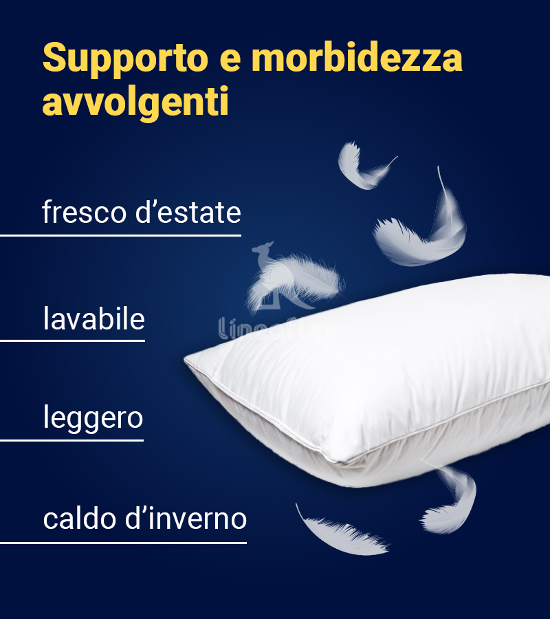 Guanciale imbottito in 100% piuma e piumette d’oca bianca extra soft dalle proprietà naturalmente termoregolatrici.