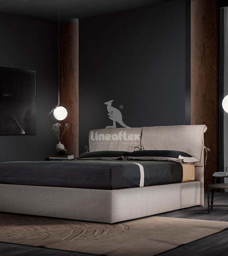 Il letto Grazia proposto da Lineaflex รจ rivestito in morbido tessuto cangiante e vellutato antimacchia e idrorepellente, colore a scelta, e corredato di piedi di serie h. 10 cm neri (spazio dal pavimento 4 cm).