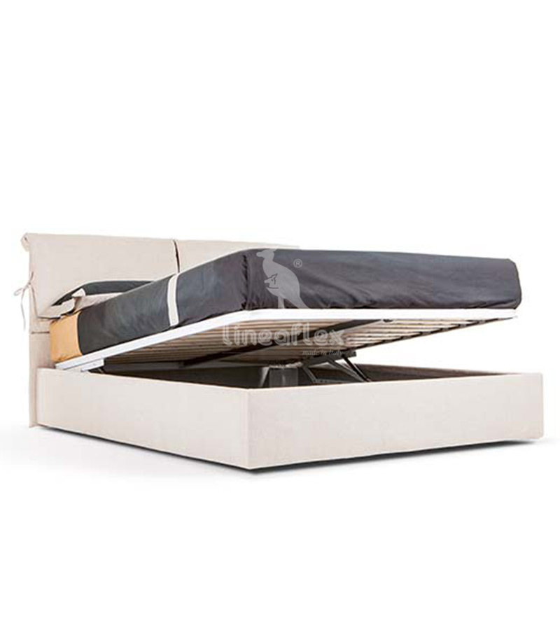 Letto imbottito sfoderabile con doppio cuscino, soffice ed elegante, allegato alla testiera dal design lineare e pulito. Disponibile per lโacquisto online in versione singola, piazza e mezza o matrimoniale. Con pratico box contenitore e rete rinforzata a doghe in legno.