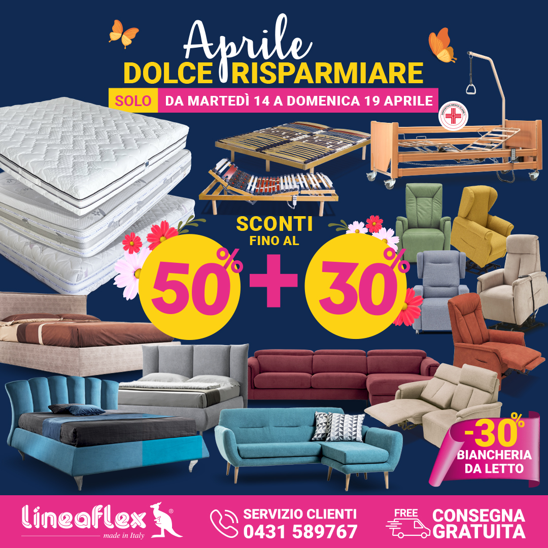 Non perdere la nostra straordinaria offerta! Fino al 19 Aprile, ti aspettiamo nei nostri punti vendita con sconti incredibili: Aprile dolce risparmiare di Lineaflex con sconti fino al 50% + 30% su tutti i nostri prodotti. Se stati cercando un materasso, un letto, una rete, un divano, una poltrona relax o della nuova biancheria da letto, abbiamo la soluzione perfetta per te, a prezzi imbattibili. Non lasciarti sfuggire questa opportunitĂ : vieni a trovarci e scopri come possiamo migliorare il tuo comfort quotidiano! L’offerta è valida anche online.
