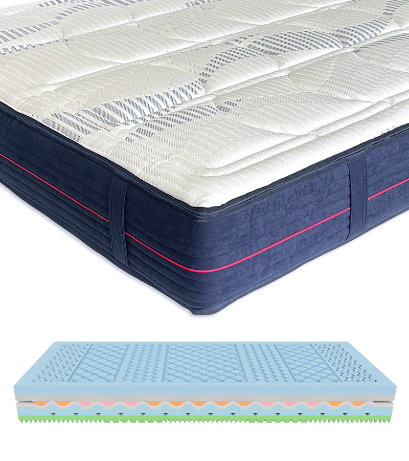 Anche l’estetica del rivestimento è stata attentamente studiata per valorizzare il materasso a 360°. Per questo motivo, l’intera fascia perimetrale è realizzata in pregiato velluto di un intenso colore blu, scelto per conferire eleganza e maestosità al prodotto. Il tutto è impreziosito da una raffinata bordatura rossa, pensata per enfatizzarne l’altezza e aggiungere un ulteriore dettaglio di carattere.